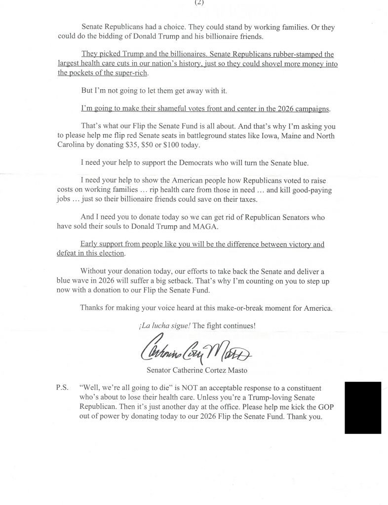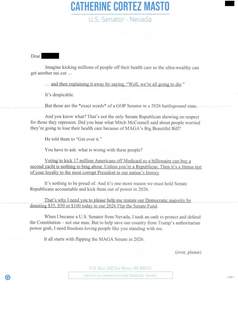Because I’ve donated to Republican candidates in the past, I get so many fundraising letters from people on my “team”. I don’t get any letters from the other side. However someone recently gave me this letter from Nevada’s Democrat Senator, Catherine Cortez Masto. For me it was a rare chance to see what the other side is saying.