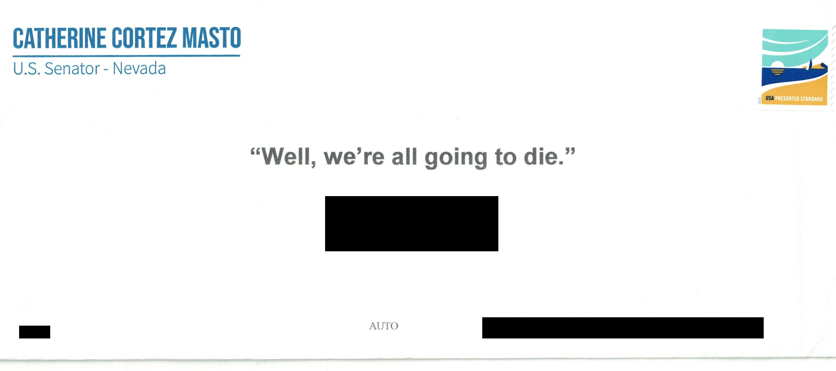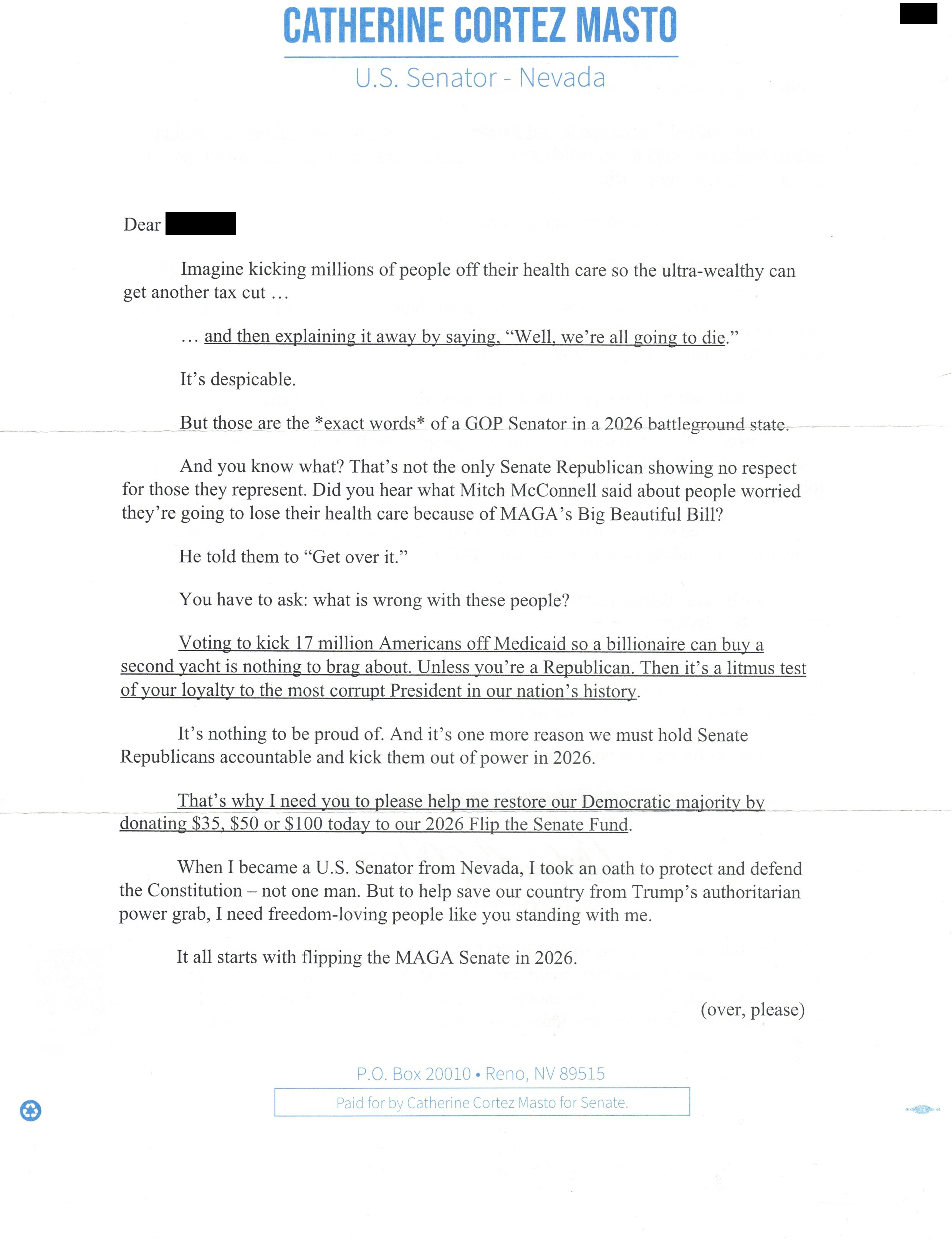 Because I’ve donated to Republican candidates in the past, I get so many fundraising letters from people on my “team”. I don’t get any letters from the other side. However someone recently gave me this letter from Nevada’s Democrat Senator, Catherine Cortez Masto. For me it was a rare chance to see what the other side is saying.